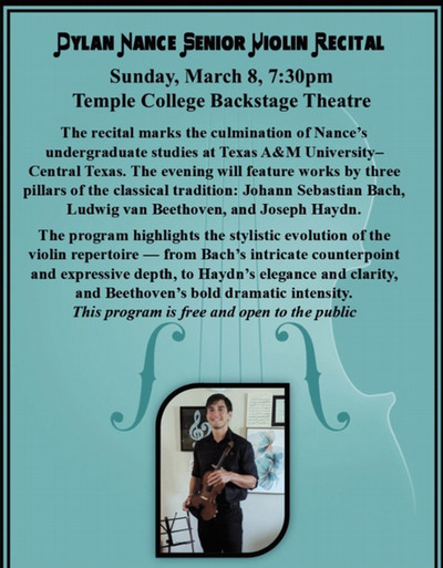 Dylan Nance's Senior Violin Recital to be held on Sunday, March 8 at 7:30 pm in the Graeter-Jackson Theatre at the Mary Alice Marshall Performing Arts Center.